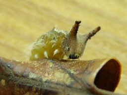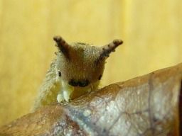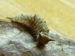 | 12月14日 越冬中のゴマダラチョウの幼虫。 つのがあるなんとも愛らしい顔と、背中の突起が特徴。 |