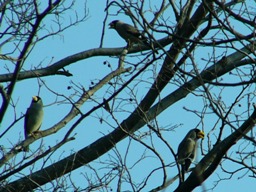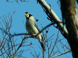 1月10日 ムクノキの実を食べに来たイカル。 黄色い大きなくちばしが特徴。 |