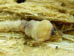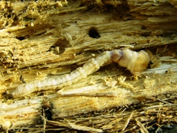 | 1月16日 コナラの朽木で越冬中のタマムシの幼虫。 成虫とは似ても似つかない。 |